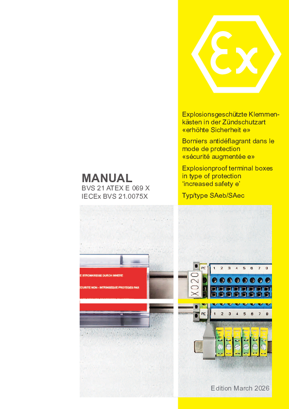 | Manual BVS 21 ATEX E 069 X - Klemmenkästen SAeb/SAec | September 2025 | PDF 🢃 | 5.7 MB |