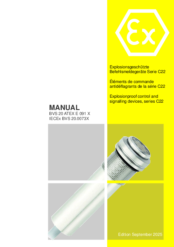 | Manual BVS 20 ATEX E 091 X - Emergency stop device type C22 | October 2025 | PDF 🢃 | 7.8 MB |