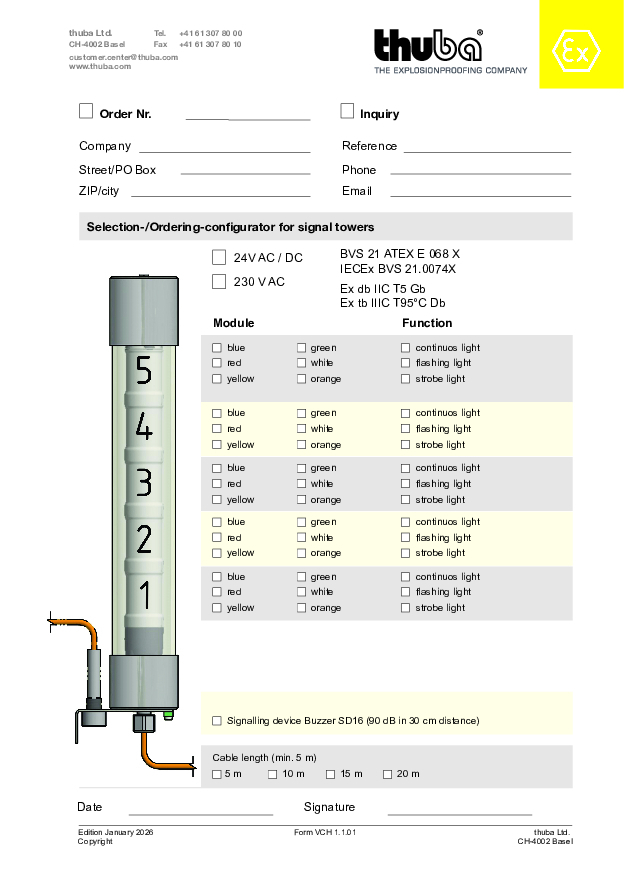 The explosionproof signal tower (Ex db IIC T5 Gb, Ex tb IIIC T95°C Db) ensures a better control over all important processes and, consequently, an increased availability of installations in hazardous areas. The signal towers are an important feature of installations, as with their help it is possible to provide early warning functions that allow the operator to avoid a standstill of the installation.